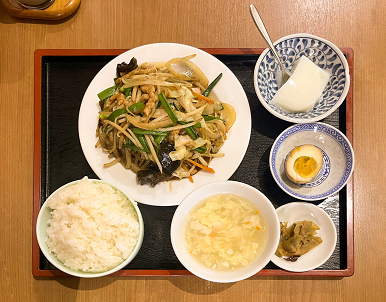 肉野菜炒め (ライス、小鉢、漬物、杏仁豆腐付き)