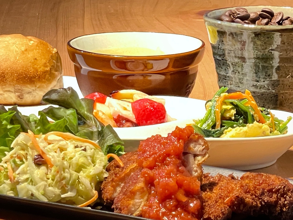 肉や魚介類のメインメニューに、3種類以上の野菜料理と野菜のスープが付きます。