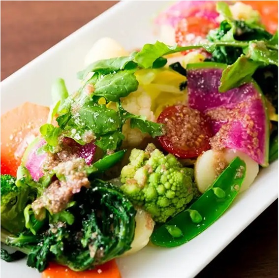 地元で採れた野菜を沢山とってもらうため、温野菜にしてアンチョビソースをかけて提供しています。