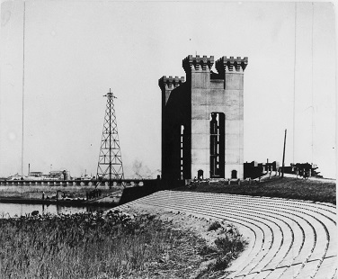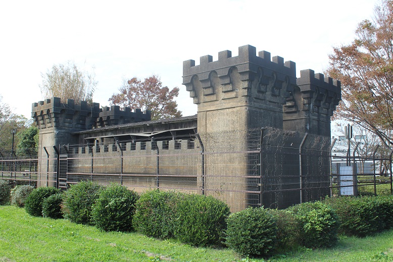 - 旧小松川閘門新旧歴史を刻む小松川閘門荒川放水路開削により旧中川との水位差解消のため、昭和5年に完成し昭和50年代に廃止されました。現在は水上交通の衰退により廃止され、小松川公園内に保存されています。中世の城館のような旧閘門は旧中川側の1基が残され2/3は地中です。東京都選定歴史的建造物です。