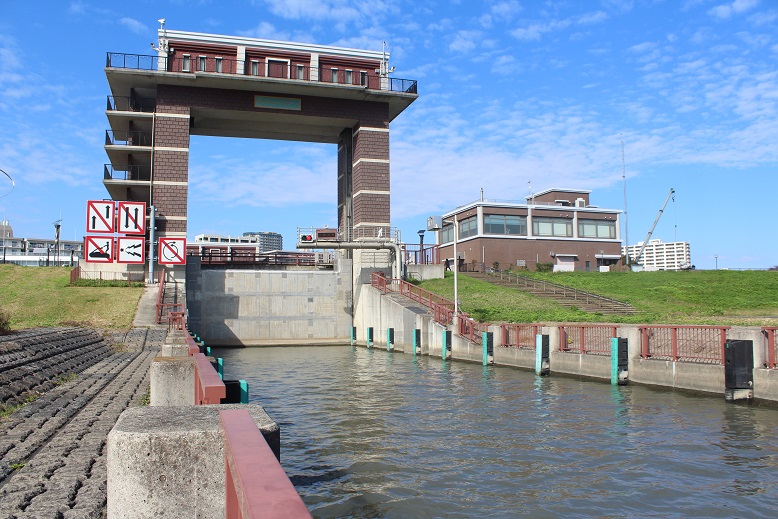 - 荒川ロックゲート荒川と旧中川とを結ぶ閘門荒川と旧中川は水面差が最大3.1メートルにもなるため、船の往来が不可能でしたが、ロックゲートの完成によって、荒川と旧中川、小名木川、そして隅田川が結ばれました(平成17年10月完成)。震災時の支援活動を想定してつくられており、阪神淡路大震災クラスの地震があっても速やかな航行が可能です。
