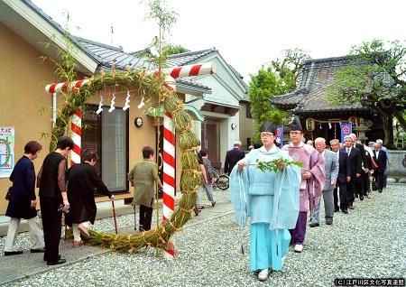 - 北野神社例祭茅の輪くぐり茅の輪くぐりは毎年6月25日に行われ、境内に茅でできた輪が立てられ、氏子が無病息災を長い、家族の氏名や年齢を書いた人形をもってくぐります。区無形民俗文化財に指定されています。